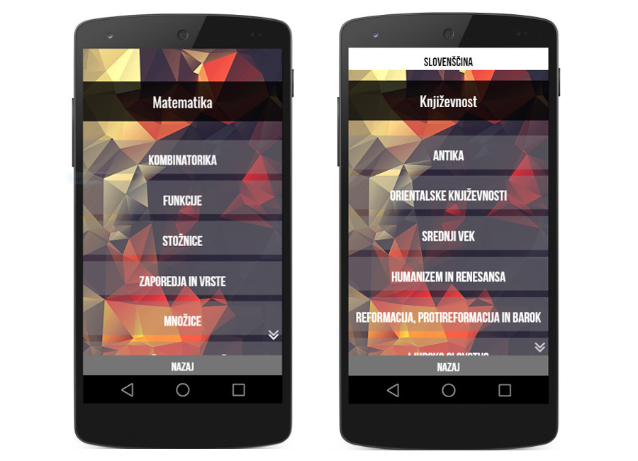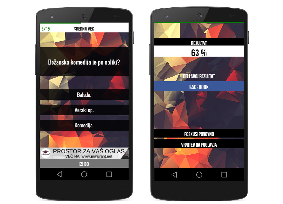 Maturant is a learning app for Slovenian high-school students. It has more than 2000 questions, different subjects and categories. It's made with Adobe PhoneGap - a hybrid technology for building cross-platform mobile apps.
