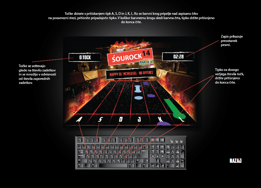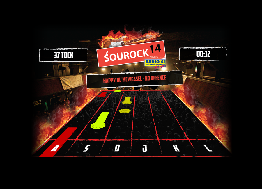 ŠouRock is a "Guitar Hero" style game. You choose a song, and then play the guitar by pressing on keyboard keys. With achieved score, you increase your rank, and compete with other players. Game is made with HTML5, canvas (3D), Three.js and other web technologies.